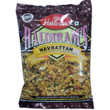 Haldiram's Navratan Mix is made from gram pulse, red lentils, gram flour, potatoes, peanuts, rice flakes, spinach leaves, spices in mild flavor, groundnut oil (peanut oil), edible salt and citric acid.